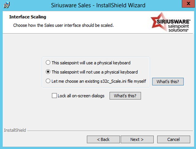 6. You are presented with the following dialog. Select whether or not this salespoint will utilize a physical keyboard. The Sales installer will install an appropriate s32c_Scale.INI file depending on which option is selected. The s32c_Scale.INI file specifies how the various dialogs in the Sales interface will be scaled and positioned. If you specify that this salespoint will not use a physical keyboard, the Sales interface will include an on-screen keyboard where necessary, and will be scaled appropriately. If you would like Sales to use a pre-existing custom s32c_Scale.INI file, select Let me choose an existing s32c_Scale.ini file myself.