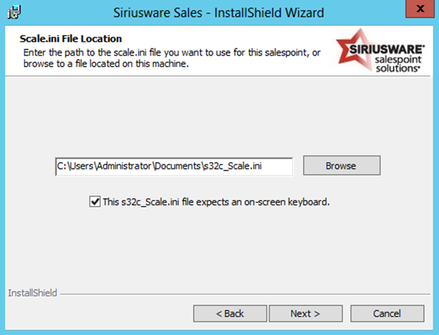 7. If Let me choose an existing s32c_Scale.ini file myself was selected on the previous dialog, you are presented with the following dialog. Click Browse to browse to the s32c_Scale.ini file located on your computer that you would like to use with Sales. During installation, a copy of this file will be made and placed into the appropriate directory. You may still specify whether Sales should include an on-screen keyboard. If this s32c_Scale.INI file expects an on-screen keyboard is selected, the Sales interface includes an on-screen keyboard, but the scaling and positioning of the Sales interface dialogs are not modified.