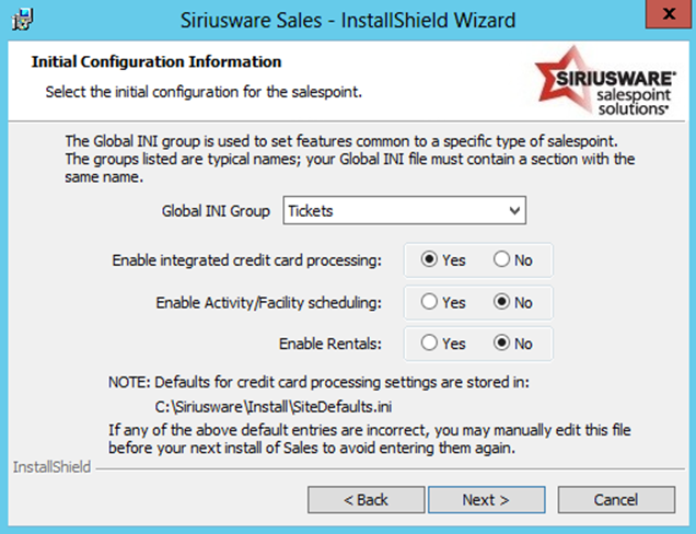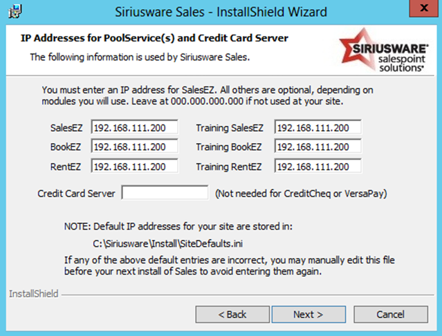 Note: In this example the CreditCardServer_IP setting has not yet been added to the SiteDefaults.INI file. Setting the Credit card server field on this dialog sets the IP address for this particular installation of Sales only: the credit card server IP address must be manually added to the SiteDefaults.INI file if you want the IP address to appear on this dialog for future installs of Sales. Click Next.