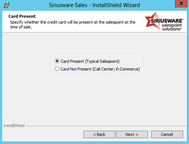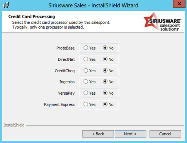 10. If you selected Enable integrated credit card processing on the previous dialog, you are presented with the following dialog. For more information on credit card installation, see the Charge Cards documentation. Select the radio button for the type of integrated credit card processing that you are implementing. As a result of your selection, certain .INI settings are added to the Sales32c.INI file. For more information on the .INI settings created by this dialog, see the Salesware .INI Settings Reference document.