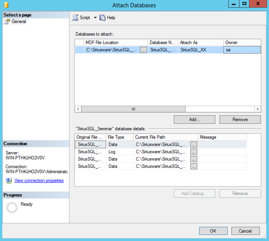 4. From the Attach Databases dialog, click the Add button, and then browse to the SiriusSQL.mdf file. Select the file and click OK. All the data files are displayed.