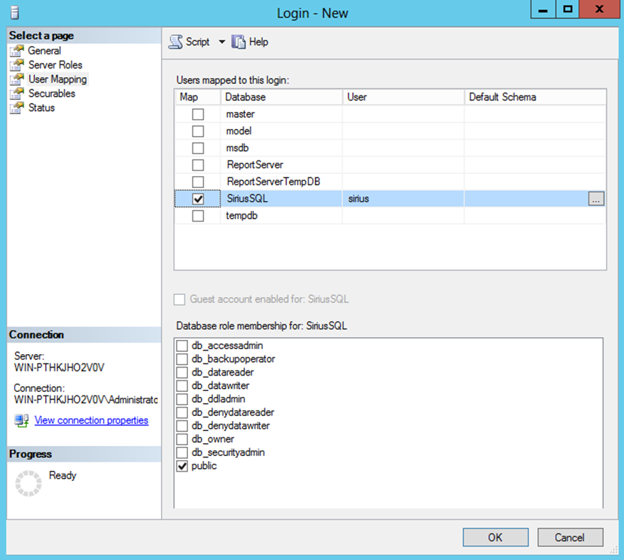 g. Go to the User Mapping page and check the SiriusSQL database. Ensure that the public box also appears as checked under Database role membership for: SiriusSQL.