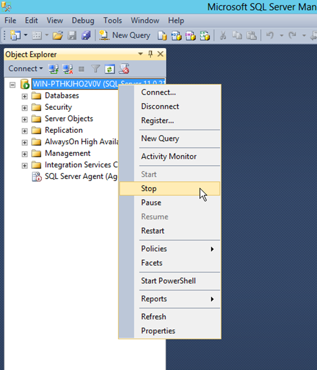1. First, make of copy of your “live” database. But before you can duplicate it, SQL Services must be stopped. To do this, open Microsoft SQL Server Management Studio and log in. Right-click on the SQL server name and select Stop.