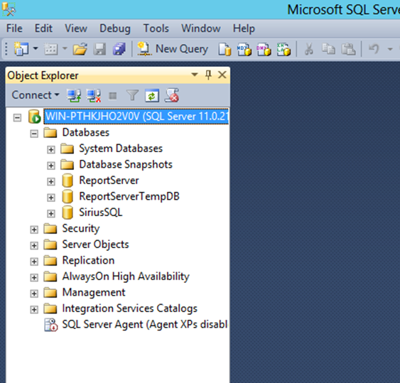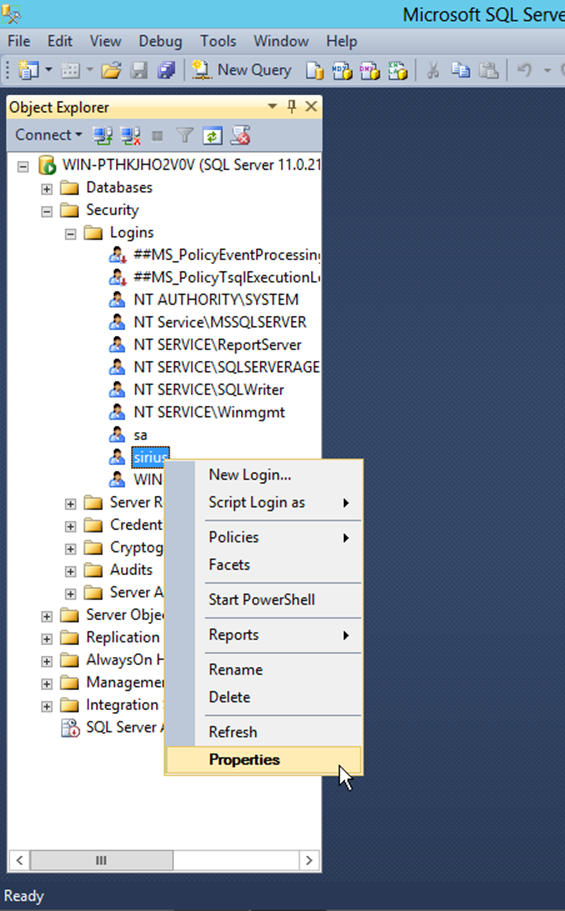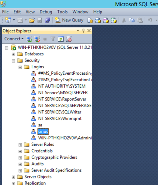 11. The last step is to give the user sirius access to the newly installed database. In Microsoft SQL Server Management Studio, expand Security on the left side of the screen and then expand Logins. You see the user sirius listed.