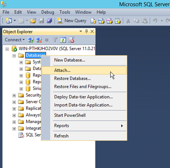 7. The next step is to attach the training database. With the Microsoft SQL Server Management Studio application still running, expand Databases on the left side of the screen.