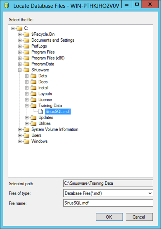 9. The Attach Databases dialog opens and prompts you for the location of the database files. Click Add to browse to the location of the duplicated database files that reside in your newly created Training Data folder and select the SiriusSQL.MDF file. Click OK.