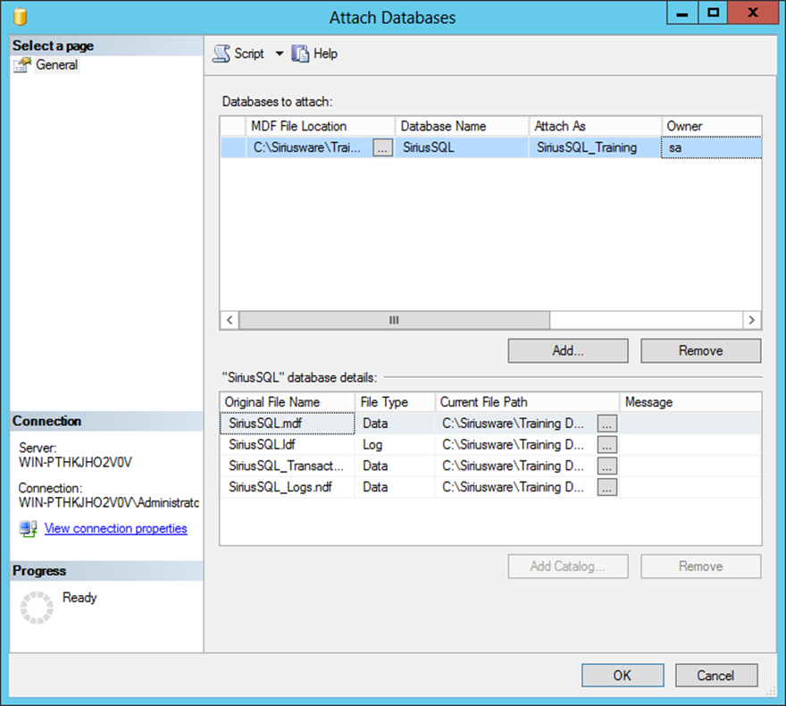 10. You see the following dialog, indicating the location of the files that are ready to attach. Ensure that the name to attach the database is SiriusSQL_Training (in the Attach As field) and the owner of the newly attached database is still SA. You can modify either of these fields by double-clicking on the field and editing it. Click OK to attach the database.