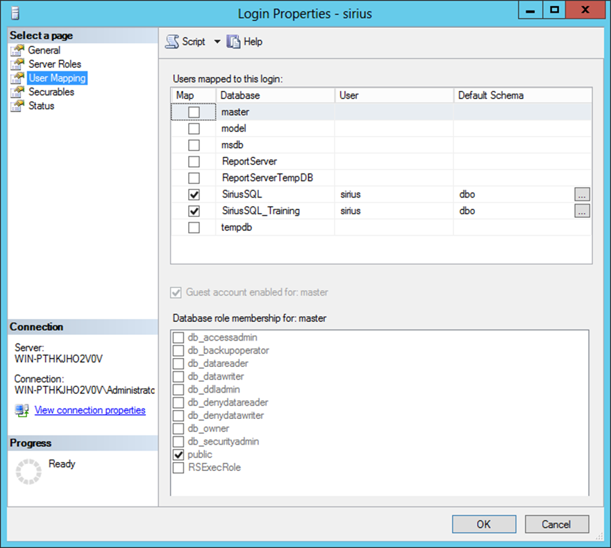 13. Click User Mapping and ensure that there is a checkmark in the Map column next to SiriusSQL_Training. (You now have checkmarks for both accesso Siriusware databases, allowing this one user access to both databases.) Click OK.