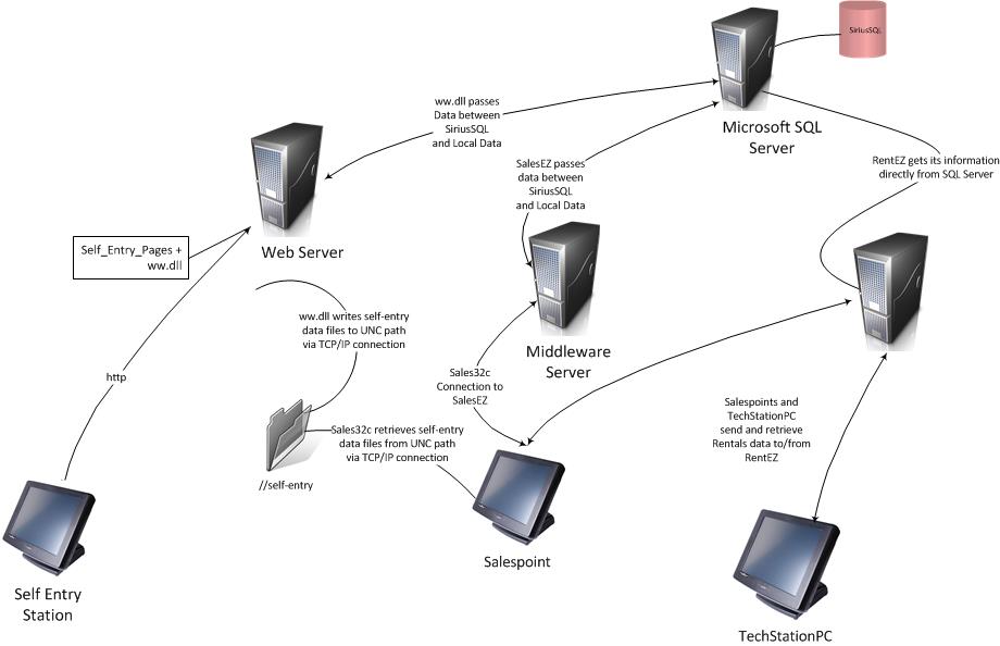 The Rentals module environment includes Self-Entry stations, Rental TechStations, salespoints and either a web/rental server or separate web and rental servers. For most installations, a combined web/rental server is sufficient. The following diagram shows separate web and rental servers.