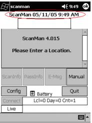 The current date and time of the unit is displayed at the top of the ScanMan screen. It is important to verify that these are correct, as they are recorded with the scans that happen.