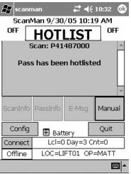 When ScanMan module is running offline, there is support for a Hotlist file. The Hotlist file can contain a list of all passes and tickets that have been voided, expired, etc. This prevents bad passes and tickets from being validated as good (which might occur because ScanMan module is not connected to the server).