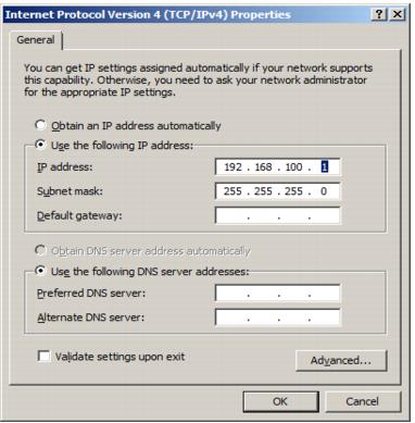 2. To change the IP address on the gate, you need a device on the same subnet as the gate. Perhaps the simplest way to do this is to change the IP address of a laptop, and then connect it to the gate with a network cable. Your laptop’s IP address can be set by going to the Network Adapter settings for IP v4:
