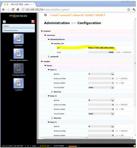 5. Under the Services > Datainterfaces > axcoem_hs tab, change the URL to the address where the Gate Access service lives.