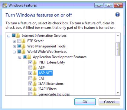 • If while installing there is no asp.net section present on IIS, go into the Control Panel to turn on Windows Features and check asp.net here: