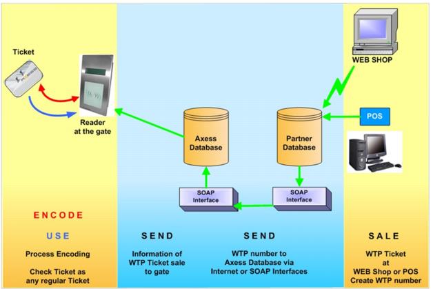 7. RF Serial numbers are generated during the ticket encoding process and inserted into the rf_serial field of the access records; and the WTP numbers are retrieved from the Axess Smart Printer and inserted into the wtp_no fields of the access records.