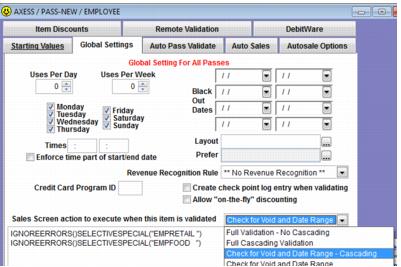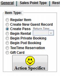 For pass items that reload existing media the item must be configured to Create Pass. The configurations within the Action Specifics are still important for Siriusware In-House Cards programs and salespoint validation features i.e., the %E discount function. And, although validation is controlled by the Axess Gates and not the configurations within the Pass Action Specifics, it is still necessary to configure the typical settings, such as Total Number of Uses, for consistency when researching guest pass records in Siriusware vs. WTP/RF Serial Numbers in Axess and for exchanges.