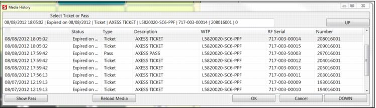 The Media History dialog allows you to select a ticket or pass. It displays information such as Status, Type, Description, the WTP number, the RFSerial number and the Number. After selecting the specific pass or ticket item, you have the ability to either Reload Media or to show detailed information by clicking on the Show Pass button.