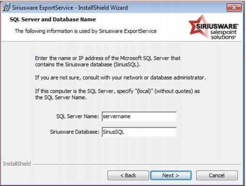 2. Enter the name of the SQL Server and the name of the Siriusware database.
