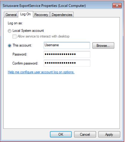 4. Open the Services Management Console by navigating to Control Panel > Administrative Tools > Services. Locate the Siriusware ExportService, double click, and then click on the Log On tab. Click the This Account radio button and enter a user account and password for the service to.