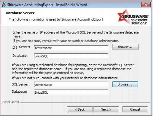 3. Enter the names of the production and reporting SQL Servers and Siriusware databases. If you are not using a replicated database for reporting the server and database names are the same.