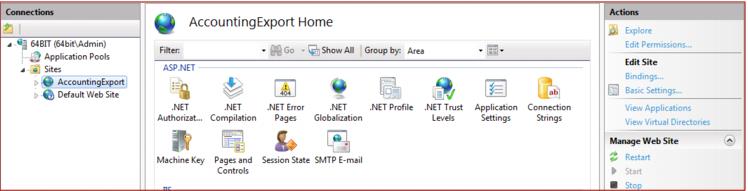 5. Accounting Export module requires SSL encryption and this must be configured manually in IIS after the installation is complete. The installer creates a new web site for Accounting Export module. If port 443 (the default for SSL) is already bound to the Default web site in IIS you need to use a different port. To create a port binding for Accounting Export module open IIS Manager and click on the AccountingExport web site.