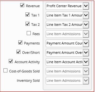 • Over/Short: Over/short amounts, as recorded during the closeout/finalization process. The Over/Short line is only activated on jobs which are based on Finalized On, as the over/short figure is officially recorded when the closeout is finalized. In addition, when reporting on Over/Short, the Payments line is set to report Payment amount counted, not Payment amount expected, in order for the job to balance correctly. Over is reported as a credit, short as debit.