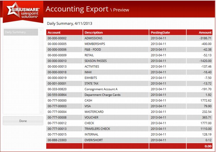 When selected, the user is prompted to Select a Date, the job’s query is executed and the results are displayed to the screen in a simple table. A totals row is included at the bottom of the preview table, summing any numeric column. This totals row does not appear in the actual export file.