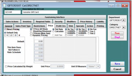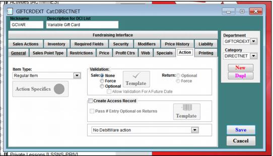 1. Create a, “Variable Gift Card” item and set Validation to None.