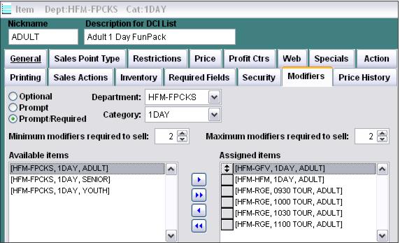 Visitors to the museum may purchase each of these products independently or they may purchase a Fun-Pack that allows the selection of two out of the three options for a discounted rate. The Fun-Pack program was implemented using a combination of modifier functionality and Dynamic Pricing capability. The basic Adult Fun-Pack program implementation is as follows: