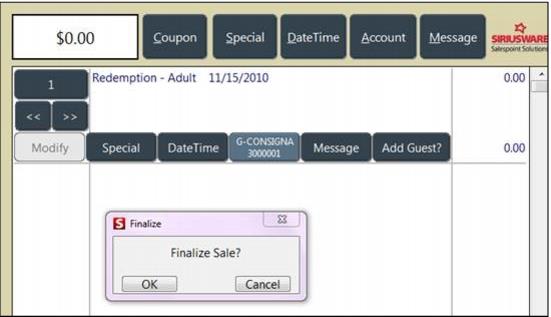 When the tickets are scanned to do the auto-sale back to the account (using the %A function in Sales in this example), note that the price of the redemption item is still $0. It does NOT get set to the “move” amount specified in the Revenue Rule for that particular access number: