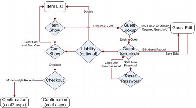 E-Commerce web pages page flow begins with the ItemList.aspx page. From there it flows to the ItemShow.aspx page. Depending on how the software is configured and what item was selected in order to move to the ItemShow.aspx page, the next page to display is one of the following: Liability.aspx, CartShow.aspx or GuestLookup.aspx.