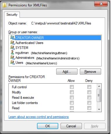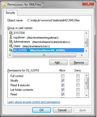 11. Ensure the \IIS_IUSRS user has Modify permissions assigned to the following files/folders: