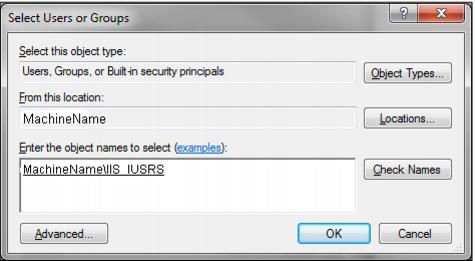 5. The entry in the Enter the object names to select text box appears as MACHINENAME\IIS_IUSRS.