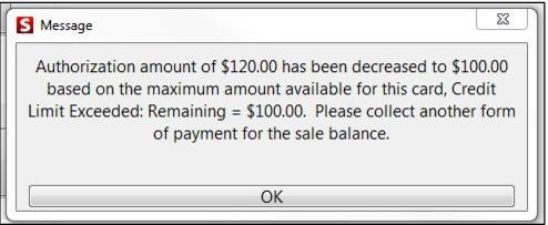Note: This auto-adjustment happens immediately upon entering the card number on the Credit Card dialog in order to facilitate the speed of In-House Cards transaction. The operator does not have to wait until after clicking Finalize/Save/Pay to find that the amount to be charged to the card exceeds the available balance. All credit limits, daily spending limits, total spending limits and invoice balances are checked when the auto-adjustment is calculated. For instance, a sale total is $100. The card swiped for payment has an available invoice balance of $250. But, the card also has a daily spending limit of $50. The amount to be charged to the card is adjusted to $50.
