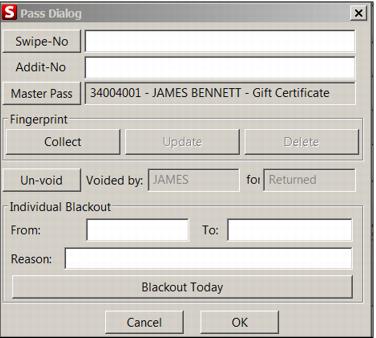 On Guest Lookup > Pass Inquiry > edit pass > Modify there are three new buttons on the Pass dialog for collecting, updating and deleting fingerprints associated with a IHC item. If the IHC item does not have a fingerprint associated, the Collection button is active unless the operator does not have the security permission to do so. If the IHC/pass has a fingerprint associated the Update and Delete buttons are active if the operator has the security permissions to use them.