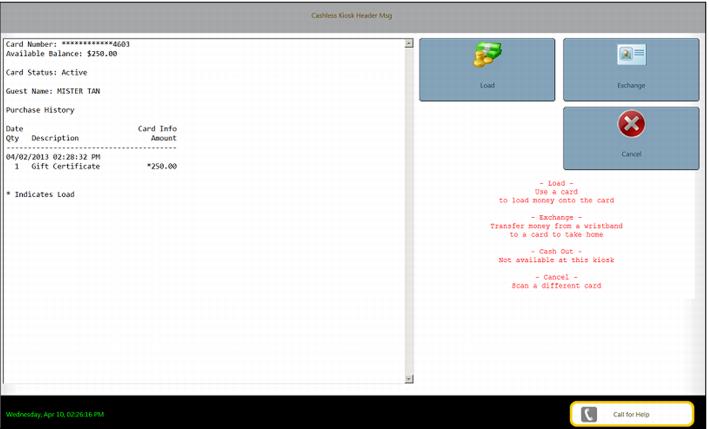 After the fingerprint is read, the user is taken to the next Cashless Kiosk screen where the IHC can be loaded.