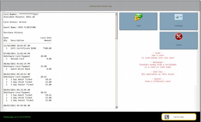 4. To Exchange a card, press the Exchange button. The current card/band is voided and a new card (new number) is printed on ten mil. card stock from the Boca printer in the Kiosk.
