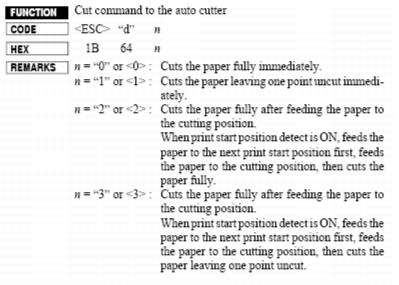 With functions like this, it is necessary to choose what option is to be used, and then add that to the script. For example, if it is desired to have the paper partially cut without feeding paper first, this code would be used: