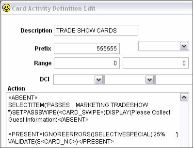 The Marketing department wants to issue 10,000 cards at various trade shows in the area. These Trade Show Cards provide a 25% discount on a 1-Day Adult Entrance ticket. The cards can only be redeemed once per day. The Marketing Department wants to collect guest information for those cards that are redeemed. In order to prevent having to manually enter 10,000 pass sales to generic guest records through Salesware, considering only a fraction of the cards might be redeemed, the business decides to use the card activity table functionality for this program.