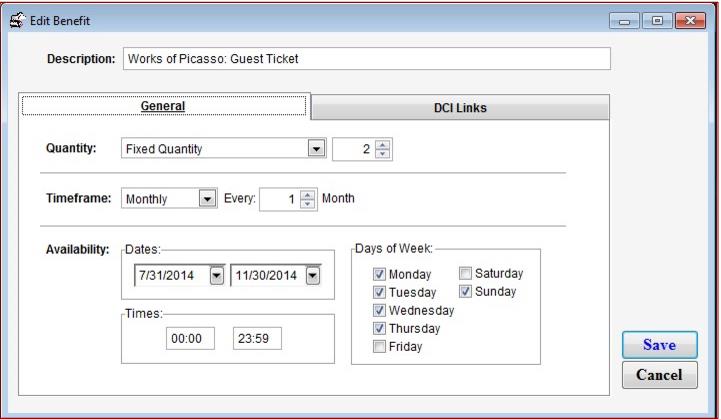 • Availability – Provides options for Dates, Times and Days of Week for benefit redemption