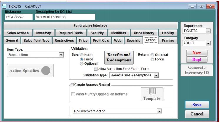 On the Action Specifics dialog a new Assigned Benefits tab, allows you to select the benefits to be assigned to a Memberships/Passes product. The benefits listed are retroactive, so that as new exhibits, lectures, discounts, etc., are introduced, they can be added to existing memberships.