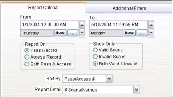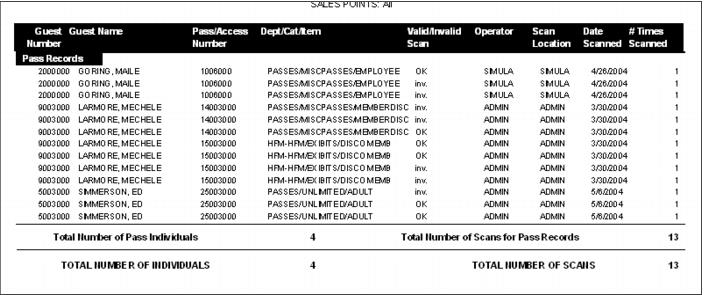 Provides detailed information per scan (such as operator and location). Can be sorted several ways and run for access and/or pass records as well as valid and/or invalid scans.
