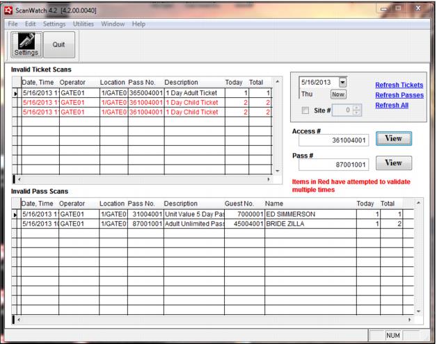 ScanWatch is a utility that can be used to monitor invalid scan activity for both access and pass records when using the Salesware Access Control functionality (scanning passes and tickets with either ScanMan or GateKeeper modules). Detailed scan history for a pass or access record may be viewed by double-clicking on one of the scan log records or by entering the access or pass number in the entry boxes provided.