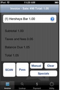 Screen captures below show the Sales Invoice after a barcode on a Hershey’s Bar is scanned. To set the quantity > 1 or to delete the item or refund, select the blue arrow pointing to the right on the line item.
