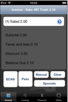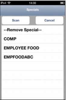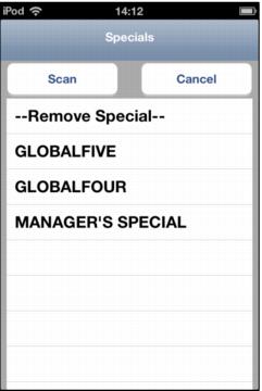 Choosing Specials on the Invoice tab will display a list of the available global specials. Use the Scan button or the button located on the side of the Linea Pro hardware to scan a barcode configured to add the global special to the sale. (For more information on barcode specials see below.) An assigned special can be removed by using - - Remove Special - - selection.