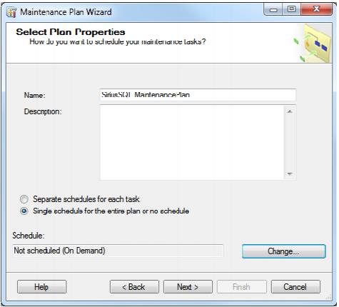 1. The Wizard opens and asks you to name the Maintenance Plan and set the schedule. Give the plan a good name like, “SiriusSQL Full Backup”.