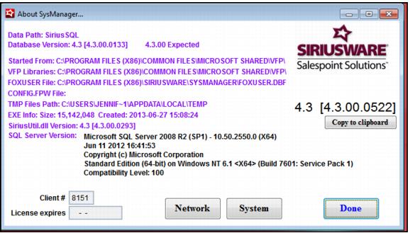 Familiarity with version number verification of your software components is critical. The verification process allows you to confirm that you are running the most current versions of the software available (by comparing your current version number with what is available on the Siriusware web site). Also, knowing the version number can minimize the time it takes Siriusware Technical Support to deliver a solution to your technical problem.