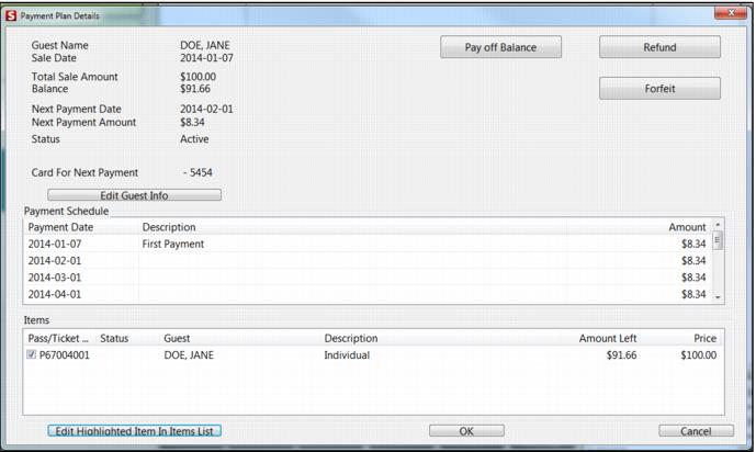This provides detailed information on the guest, remaining Balance, Next Payment Date, Next Payment Amount, Payment Schedule and the specific pass information. You can also Pay off the Balance, Refund or Forfeit an item attached to a Payment Plan. From the Payment Plan Details dialog, you can edit gust information by selecting the Edit Guest Info button. From here you are redirected to the Guest Edit dialog. Pass edits can be made by highlighting the appropriate Pass/Ticket item with the Item selection box, and then clicking on the Edit Highlighted Item In Items List button. From here you will be directed to the Pass Inquiry form.