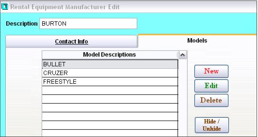 The Rental Equipment Manufacturers list is used to associate various models of equipment with the manufacturer. The manufacturers and models configured in this list may then be associated with rental equipment and subsequently used as filters within SysManager > Activities > Rental Activities > Rental Inventory. Contact information for the manufacturer may also be entered within this list.
