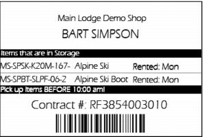 Another label/tag that can be useful at times is a storage ticket. A Graphic layout can be configured in SysManager and printed at the TechStation (via RentPrint application) that lists the items that are currently in storage. The label/tag may then be attached to the equipment to identify it from other equipment in storage.